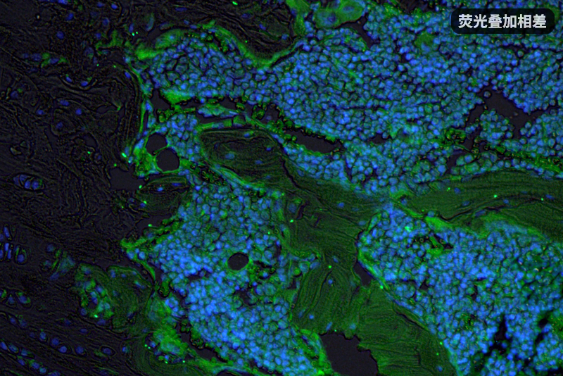 無限遠光學顯微鏡可以做到相襯成像視野和熒光成像視野完全一致,因此可以拍攝合成出有輪廓感/立體(ti) 感的細胞熒光圖像。一般這需要先用平場消色差相襯物鏡拍攝相襯,然後切換到半複消色差物鏡拍攝熒光,以免損失熒光亮度,為(wei) 了方便用戶進行這種拍攝,明美還推出了半複消色差相襯物鏡,可以一個(ge) 物鏡把相襯和熒光都拍好。