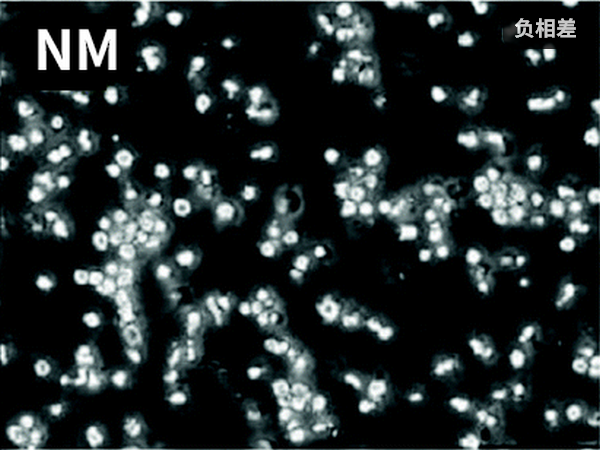 相襯觀察還有正負和對比度高低之分,常見的相襯是正相襯,背景是亮色的,樣品被高亮光環包圍。而負相襯背景呈暗色,類似暗場,樣品主體(ti) 會(hui) 呈高亮。負相差物鏡有高對比(NH)和中對比度(NM)區別,會(hui) 標記在物鏡上。
