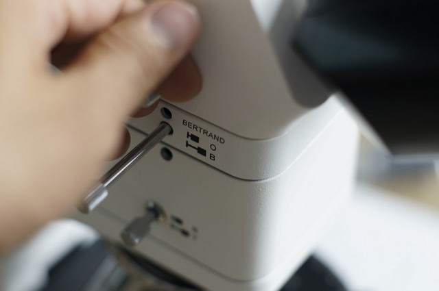 ④勃氏鏡(Bertrand Lens):勃特蘭(lan) 透鏡在錐光觀察時使用,用於(yu) 形成幹涉圖,幹涉圖的形態因晶體(ti) 的光性和切片方向而不同,可借以鑒別晶體(ti) 的軸性、切片類型、光性符號等屬性。必須搭配無應力物鏡使用。