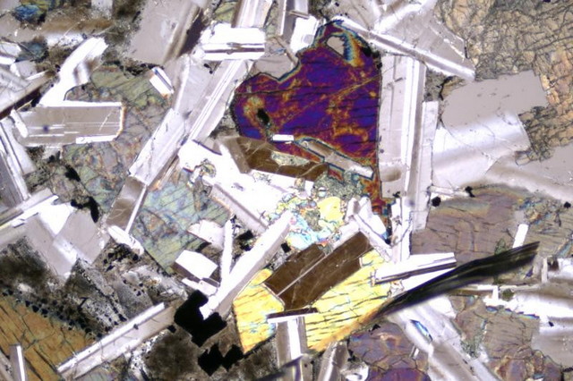 ②正交偏光:起偏檢偏成90°時,樣品從(cong) 單偏光進入正交偏光狀態,正交偏光圖像特點,隻有晶體(ti) 會(hui) 有光,其他非晶體(ti) 會(hui) 暗下去,類似熒光。主要觀察礦物的消光,幹涉色,延性,雙晶等現象。